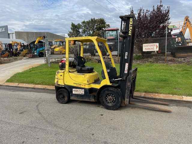 Chariot élévateur Hyster 2,5 tonnes gaz 2012 1388 heures Positionnement des fourches Déplacement latéral.