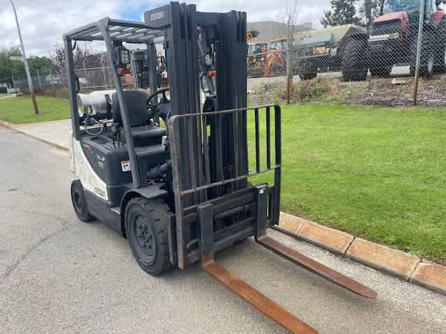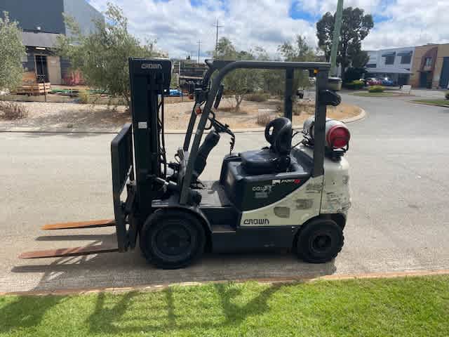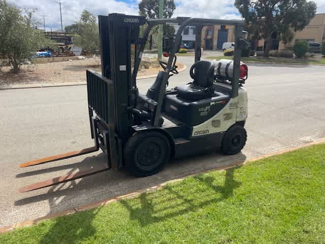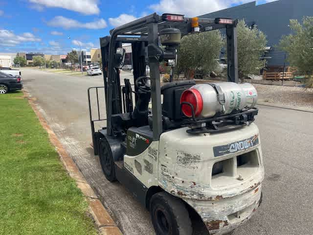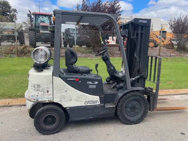 Chariot élévateur Crown CG2.5 2,5 tonnes Gaz – Mât pour conteneur à 3 étages – Déplacement latéral – Positionnement des fourches – 9564 heures – Année 2011.